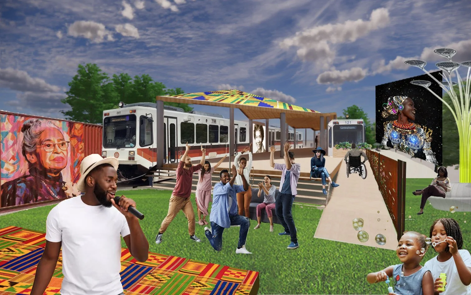 Our AfroFuturism Oasis project turns imagination into infrastructure. Through art, design, and sustainability workshops, community members help transform retired MAX trains into a thriving hub for creativity, digital learning, and rest.